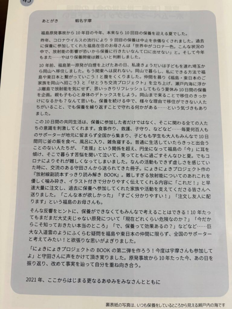 当初の私には、この冊子に出てくるようなお母さんたちの仲間はいなかったな。事実を教えてくれるような、”逃げろ”と伝えてくれるような、このミスターまとめ(守田敏也さん)のような存在など知る由もなく。