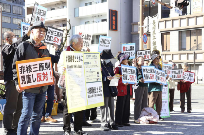長崎市で開かれた集会で、非核三原則見直しに抗議する参加者=22日午前 共同通信