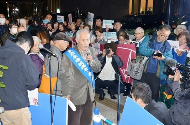 国会前で「非核三原則の見直し反対」などを訴える被爆者ら=21日夕 西日本新聞